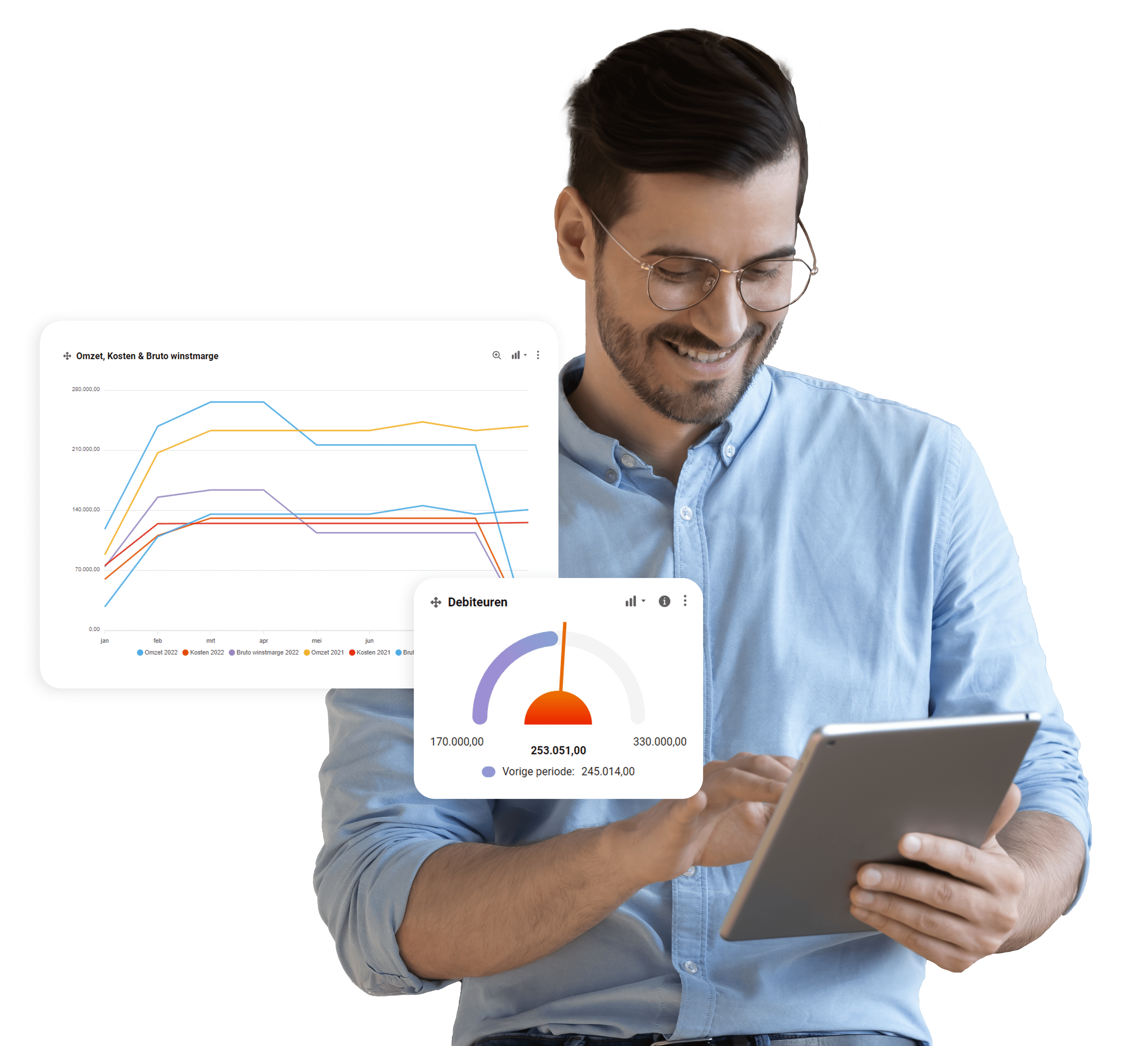 Met Speedbooks® beschik je over een grote diversiteit aan kant-en-klare rapportmodellen. Of je nu een managementoverzicht, een maandanalyse of een jaarrekening nodig hebt, het is allemaal mogelijk. Het financieel dashboard geeft je grafisch overzicht van jouw financiële bedrijfsperformance. Zo heb jij al jouw cijfers overzichtelijk in één overzicht.